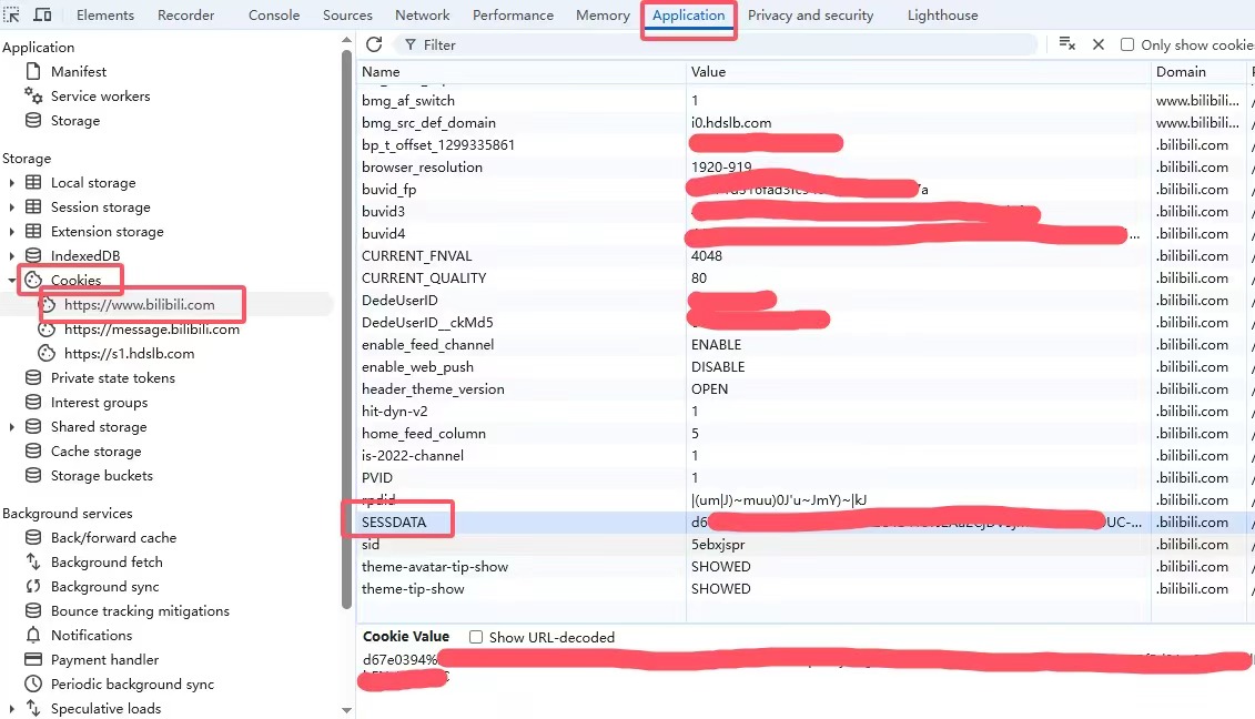 ပထမဦးစွာသင့်ဘရောက်ဇာကိုဖွင့်ပြီး bilibili.com သို့သွားပါ၊ ဝင်ရောက်ပါ။ နောက်ပြီးဝင်ရောက်သည့်စာမျက်နှာတွင် ညာဘက်ကလစ်နှိပ်ပြီး "စစ်ဆေးရန်" ကိုရွေးချယ်ပါ သို့မဟုတ် "F12" ကိုနှိပ်၍ ဖန်တီးသူများအတွက်ကိရိယာများကိုဖွင့်ပါ ၁။ "Application" တက်ဘ်ကိုရွေးချယ်ပါ ၂။ "Storage" တွင် "Cookies" ကိုရွေးချယ်ပါ ၃။ နောက်ပြီး "SESSDATA" ကိုရှာပါ ၄။ ဤတန်ဖိုးကိုကူးယူပါ (အောက်ပါပုံတွင်အသေးစိတ်ညွှန်ကြားချက်များပါဝင်သည်) ၅။ နောက်ပြီး https://grabclip.com/bilibili/ စာမျက်နှာကိုဖွင့်ပြီး ကူးယူထားသည့် "SESSDATA" တန်ဖိုးကိုကူးယူထည့်သွင်းပါ၊ ထို့နောက်သင်မြင့်မားသောအသွေးအရည်ဖြင့်ဗီဒီယိုလိပ်စာကိုရယူနိုင်မည်ဖြစ်သည် ၆။ နောက်ပြီး ဤဝက်ဘ်ဆိုဒ်တွင်ရှိသည့်ဒေါင်လုဒ်ဆွဲယူမှုကိရိယာကိုသုံး၍ ဗီဒီယိုကိုသင့်စက်တွင်ဒေါင်လုဒ်ဆွဲယူနိုင်မည်ဖြစ်သည် ၇။ နောက်ထပ်မေးခွန်းများအတွက်အောက်တွင်ရှိသည့် "အလေ့အကျင့်မေးခွန်းများ" ကိုကြည့်ပါ